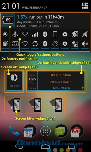 Tương thích SmartWatch 2: Ứng dụng bổ sung bộ hiển thị mức pin 1x1 mới và widget thông báo thời lượng sạc còn lại, hiển thị trực tiếp trên màn hình đồng hồ thông minh. Người dùng có thể dễ dàng chuyển đổi giữa các chế độ pin bằng cách vuốt sang trái hoặc phải.