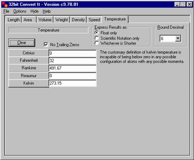 32bit Convert It hỗ trợ những loại đơn vị nào? Phần mềm hỗ trợ chuyển đổi các đơn vị đo khoảng cách, diện tích, thể tích, trọng lượng, mật độ, tốc độ và nhiệt độ.