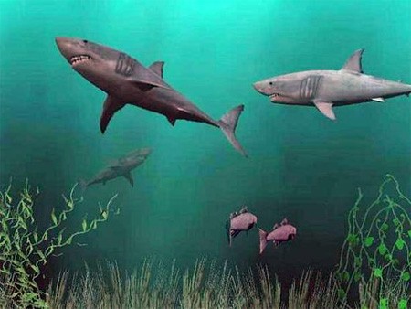 Các mô hình cá mập 3D được tái hiện một cách chân thực và sinh động, với chuyển động tự nhiên theo dòng chảy của nước và sự hiện diện của vô số đàn cá nhỏ xung quanh.
