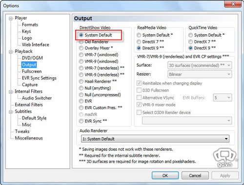 Tại trường DirectShow Video, hãy đánh dấu vào ô System Default (đối với Windows 7) hoặc ô VMR-9 (renderless). Cuối cùng, nhấn Apply để lưu thay đổi.