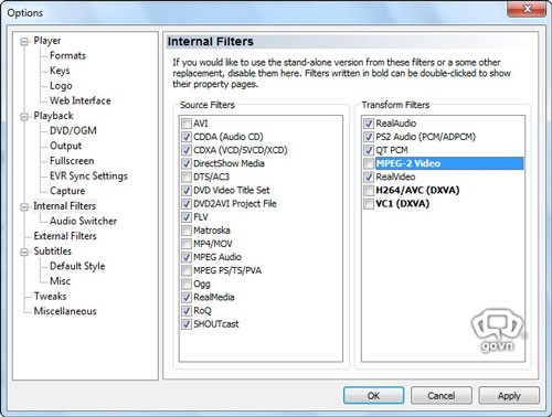 Để Media Player Classic tự động phát các phim DVD ở định dạng 3D, bạn tiếp tục chọn mục Internal Filters ở phía bên trái.