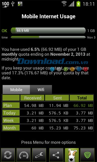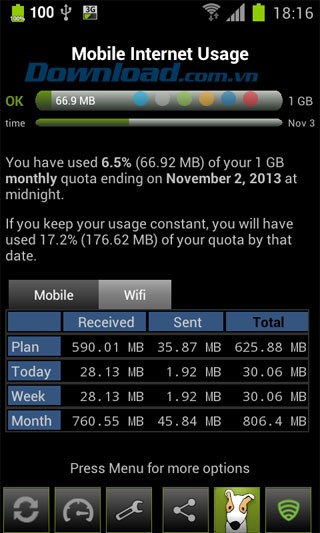 Ứng dụng này cung cấp các thông báo trực quan về mức sử dụng dữ liệu theo ngày, tuần và tháng. Bạn hoàn toàn có thể tùy chỉnh giới hạn dung lượng và ngày bắt đầu chu kỳ thanh toán của gói 3G hiện tại.
