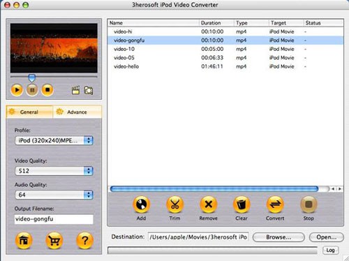 Ứng dụng 3herosoft iPod Video Converter for Mac có khả năng sao chép các tập tin video và audio từ hầu hết mọi định dạng hiện có sang các dòng iPod và iPhone khác nhau.