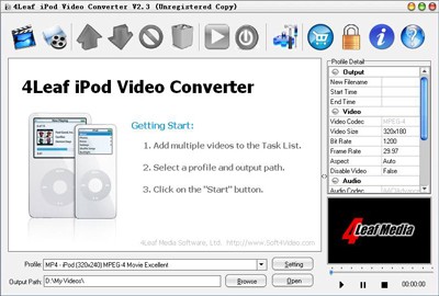 4Leaf iPod Video Converter được đánh giá là một trong những phần mềm chuyển đổi video hàng đầu hiện nay. Chương trình này hỗ trợ chuyển đổi các tập tin video từ hầu hết các định dạng thông dụng, bao gồm AVI, MPEG, MPG, WMV, Xvid, Divx, ASF, MOV, VOB,... sang định dạng tương thích với iPod video (MP4, H.264) với tốc độ nhanh chóng.