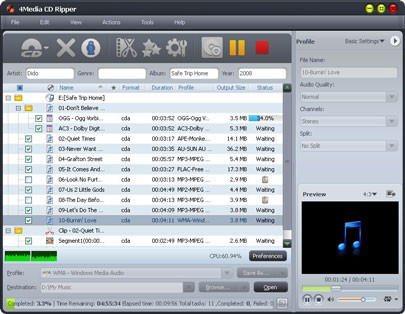 4Media CD Ripper là phần mềm chuyên dụng để giải mã dữ liệu từ đĩa CD, hỗ trợ chuyển đổi sang nhiều định dạng âm thanh thông dụng như MP3, WMA, WAV, AAC, FLAC, OGG, APE. Nhờ đó, người dùng có thể dễ dàng thưởng thức nhạc từ đĩa CD trên các thiết bị nghe nhạc khác nhau.