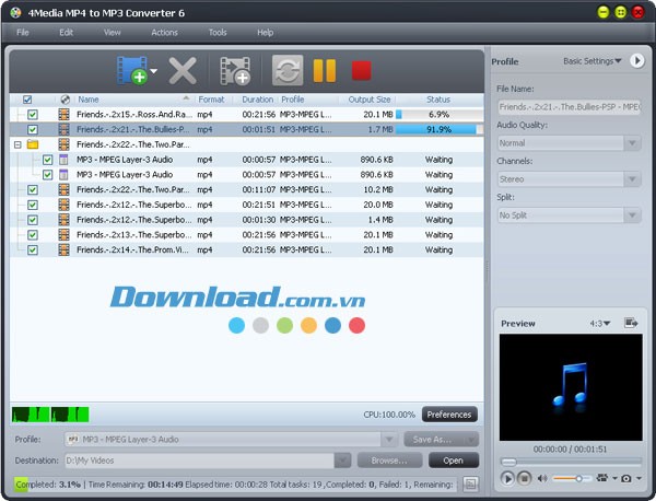 Để tiết kiệm thời gian, bạn có thể xếp tất cả các file cần chuyển đổi vào hàng đợi. Phần mềm sẽ tự động chuyển đổi các định dạng MP4, AVI, MPEG4, M4A sang MP3 theo thứ tự.