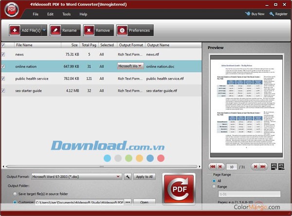 Công cụ này linh hoạt trong việc xử lý file, cho phép bạn chuyển đổi toàn bộ tài liệu hoặc chỉ chọn các trang cụ thể theo nhu cầu. 4Videosoft PDF to Word Converter tương thích tốt với các phiên bản Microsoft Office như 2010, 2007 và 2003.