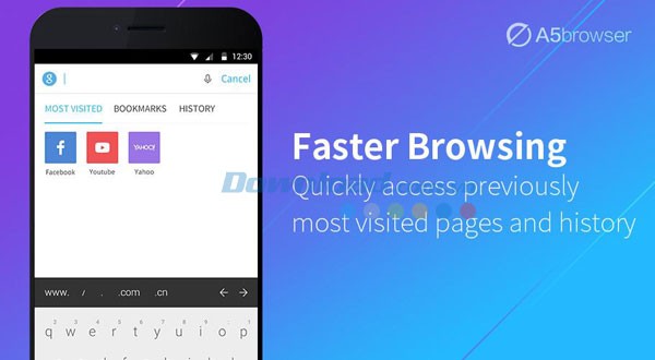 A5 Browser có dung lượng cực kỳ nhỏ gọn, chỉ yêu cầu tải về khoảng 600 KB và tiêu thụ rất ít bộ nhớ trên điện thoại thông minh của bạn.