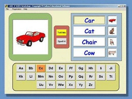 Giao diện của ABC 4 Kids Workshop được xây dựng đơn giản, thân thiện với trẻ, tạo điều kiện để các em tự làm quen và học tập độc lập. Các từ vựng được sắp xếp theo thứ tự bảng chữ cái, với 26 ô tương ứng từ chữ A đến chữ Z.
