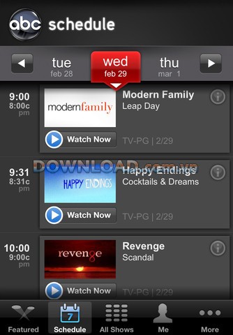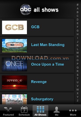 Ứng dụng cung cấp đầy đủ các tập của các show nổi tiếng như Modern Family, Grey's Anatomy, Revenge, Once Upon a Time, Happy Endings và nhiều chương trình hấp dẫn khác.