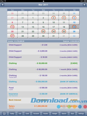 Người dùng có thể dễ dàng kiểm tra tổng quan về tài sản cá nhân của mình thông qua trang tài sản. Ứng dụng hỗ trợ tổng kết tiền mặt, thẻ tín dụng và các tài khoản ngân hàng hàng tháng.