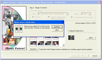 Tiếp theo, chương trình sẽ đánh giá và ước tính số lượng đĩa CD hoặc DVD cần thiết để lưu trữ toàn bộ bộ sưu tập. Khi mỗi đĩa đã được ghi hoàn tất, một âm thanh thông báo sẽ được phát ra để nhắc nhở người dùng chuẩn bị đĩa tiếp theo.