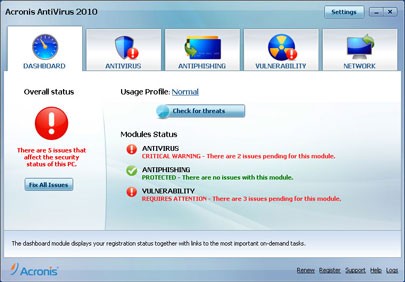 Acronis AntiVirus 2010 cung cấp khả năng bảo vệ máy tính cá nhân và gia đình trước các mối đe dọa tấn công, các hành vi lừa đảo trực tuyến, cũng như tình trạng thư rác làm phiền.
