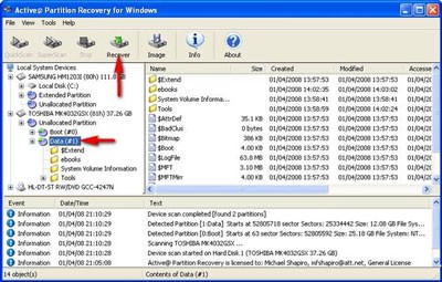 Để khôi phục một partition, nhấp chuột vào partition đó, sau đó nhấp nút Recover. Xem mục 3 để biết chi tiết về quy trình khôi phục partition.
