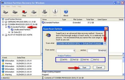 Trên hộp thoại SuperScan Options, bạn có thể chọn lại ổ đĩa ở mục Scan what. Bạn cũng có thể chọn vùng sector cần quét để giảm thời gian quét. Chọn các hệ thống file như FAT12, FAT16, FAT32, NTFS trong mục Analyze Partitions. Sau đó, nhấp nút Start để bắt đầu quá trình quét.