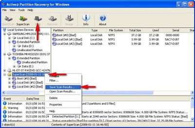 Do SuperScan thực hiện quét chậm (vì phải quét từng sector), nó có thêm tính năng lưu kết quả quét để tiếp tục khi cần thiết. Để lưu kết quả SuperScan, bấm nút Stop trên thanh công cụ khi đang quét. Các partition đã quét sẽ được hiển thị trong mục SuperScan. Chuột phải vào mục này, trên menu chuột phải, chọn Save Scan Results. Một hộp thoại sẽ xuất hiện để bạn chọn tên file (đuôi .scn) và đường dẫn lưu file kết quả.