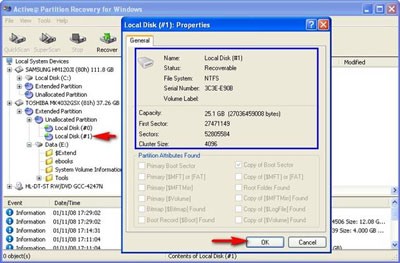 Trên hộp thoại Properties, hãy xác định xem thông tin về partition có chính xác hay không (dựa trên kích thước). Để khôi phục partition, chọn partition đó và nhấp nút Recover trên thanh công cụ (hoặc chuột phải vào partition, trên menu chuột phải, chọn Recover). Một hộp thoại sẽ xuất hiện:
