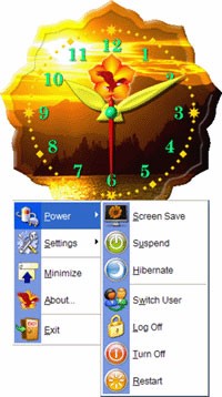 Để truy cập menu điều khiển, bạn có thể nhấp chuột phải vào đồng hồ hoặc vào biểu tượng của nó trên khay hệ thống. Trong nhóm Power, bạn sẽ tìm thấy các tùy chọn như (kích hoạt ScreenSaver với hiệu ứng cánh hoa rực rỡ); (chuyển máy tính sang chế độ Sleep); (chuyển đổi tài khoản người dùng); (đóng chương trình); (tắt máy); (khởi động lại). Hãy lựa chọn chức năng phù hợp với mục đích của bạn.