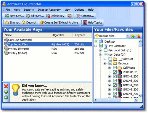 Ngoài việc sử dụng mật khẩu truyền thống, Advanced File Protector còn cung cấp khả năng tạo ra các từ khóa vật lý, được sử dụng để mã hóa và giải mã các tập tin cá nhân của bạn.