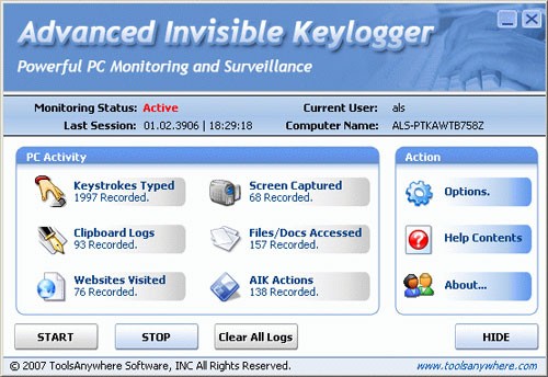 Advanced Invisible Keylogger Pro là một phần mềm ghi lại hoạt động do thám cực kỳ mạnh mẽ, được phát triển bởi ToolAnywhere. Phần mềm này hoạt động một cách bí mật, ở cấp độ hệ thống thấp nhất của Windows, bằng cách ghi lại toàn bộ các thao tác nhấn phím.