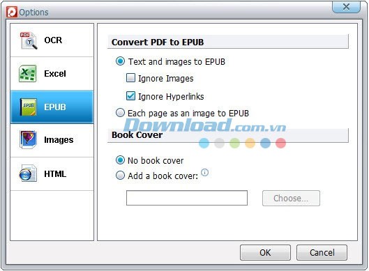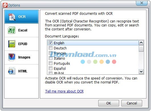 Trước khi chuyển đổi PDF được quét, nhấn nút Options bên dưới bảng điều khiển để chọn ngôn ngữ phù hợp cho tài liệu. Việc lựa chọn ngôn ngữ chính xác là rất quan trọng để đảm bảo văn bản trên file PDF được scan hiển thị đúng cách.
