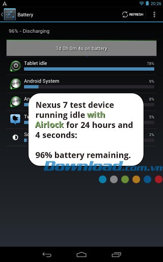 Thời lượng pin được cải thiện sẽ khác nhau tùy thuộc vào từng thiết bị Android cụ thể. Tuy nhiên, ứng dụng mang lại sự thay đổi đáng kể cho tổng thời gian sử dụng pin. Hình ảnh chụp màn hình minh họa rõ ràng sự khác biệt trong thời gian chờ 24 giờ trên Nexus 7 khi sử dụng và không sử dụng ứng dụng Airlock - Battery Saver Trial. Trong thí nghiệm này, Airlock đã đạt hiệu quả sử dụng pin cao hơn tới 275%.