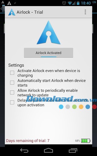Phiên bản dùng thử của ứng dụng này có thời hạn 7 ngày. Sau thời gian này, bạn có thể nâng cấp lên phiên bản đầy đủ bằng cách tìm kiếm Airlock - Battery Saver trên cửa hàng Google Play.