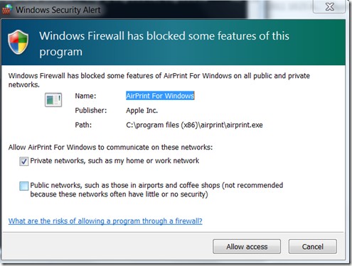 Lúc này, tường lửa của máy tính có thể hiển thị thông báo yêu cầu quyền truy cập cho ứng dụng AirPrint. Hãy chọn ô Private networks, such as my home or work network và nhấn Allow access để cấp quyền. Nếu thông báo không xuất hiện, bạn có thể tìm đến thư mục AirPrint trong Program Files và chạy tập tin airprint.exe, thông báo tường lửa sẽ hiện ra.