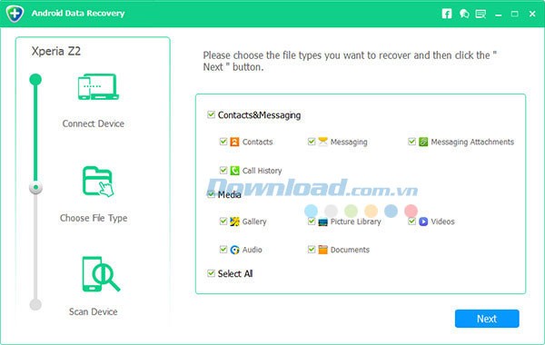 Chọn các loại tệp mà bạn muốn phục hồi, sau đó nhấn Next. Chương trình sẽ bắt đầu quá trình quét dữ liệu trên thiết bị của bạn.