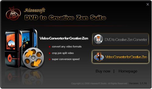 Aiseesoft DVD to Creative Zen Suite là một bộ công cụ tích hợp, bao gồm DVD to Creative Zen Converter và Video to Creative Zen Converter. Phần mềm này cho phép chuyển đổi DVD và hầu hết các định dạng video thông dụng – như AVI, MP4, MPEG, WMV, DAT, MOV, ASF, FLV, và video HD – sang các định dạng AVI, WMV, MPEG, MP3, WMA, WAV tương thích với thiết bị Creative Zen.