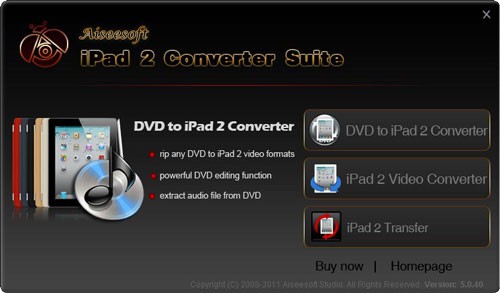 Aiseesoft iPad 2 Converter Suite hiện đang là một trong những bộ phần mềm mạnh mẽ nhất dành cho các thiết bị iPad, tích hợp ba công cụ hữu ích: iPad 2 Video Converter, DVD to iPad 2 Converter và iPad 2 Transfer.
