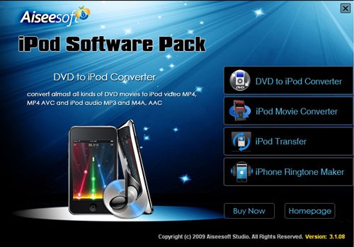 Aiseesoft iPod Software Pack là một bộ công cụ tích hợp, bao gồm DVD to iPod Converter, iPod Movie Converter, iPod Transfer, iPhone Ringtone Maker và iPhone SMS Transfer.
