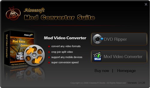 Aiseesoft MOD Converter Suite là một bộ công cụ tích hợp, kết hợp giữa MOD Video Converter và DVD Ripper, cho phép chuyển đổi định dạng MOD sang nhiều định dạng phổ biến như AVI, MPG, WMV, MPEG,...