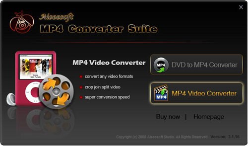 Aiseesoft MP4 Converter Suite là một bộ công cụ tích hợp, kết hợp ưu điểm của Aiseesoft DVD to MP4 Converter và Aiseesoft MP4 Video Converter. Nhờ vậy, phần mềm này sở hữu sức mạnh vượt trội và sự tiện lợi tối đa trong việc chuyển đổi từ DVD cũng như mọi định dạng video/audio sang MP4, AVI, M4A, MP3, AAC, tương thích với hầu hết các thiết bị MP4 hiện hành.