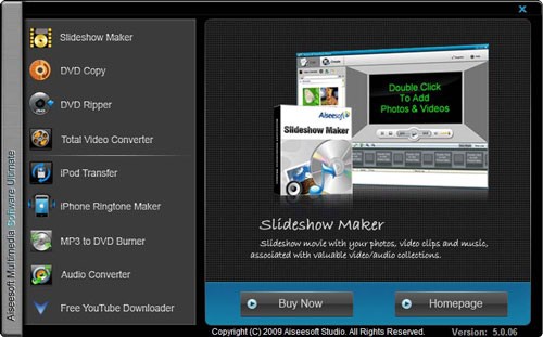 Aiseesoft Multimedia Software Ultimate là một bộ công cụ đa năng, tích hợp tới 9 phần mềm chuyên biệt: DVD Ripper, Video Converter, DVD Copy, Slideshow Maker, iPod Transfer, iPhone Ringtone Maker, MP3 to DVD Burner, Audio Converter và Free YouTube Downloader.