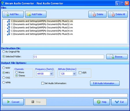 Akram Audio Converter là phần mềm hỗ trợ chuyển đổi định dạng âm thanh đa năng, cho phép người dùng dễ dàng thay đổi giữa nhiều loại file audio khác nhau. Danh sách các định dạng được hỗ trợ bao gồm: RAM, RMVB, RA, RM, RMJ, WAV, MP3, OGG, WMA, MP2, MP1, MPEG, MP4, AAC, OGG, AVI, MPC, MOV, QT, WMA, AMR, AC3, AIFF, AIF, AU, và 3GP.