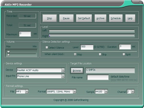 Aktiv MP3 Recorder là một ứng dụng audio mạnh mẽ, được thiết kế để số hóa các nguồn âm thanh đa dạng. Phần mềm này cho phép bạn chuyển đổi nội dung từ đĩa CD, băng cassette, DVD, các buổi biểu diễn trực tiếp, tín hiệu từ TV, đài phát thanh trực tuyến, trò chơi điện tử và bất kỳ nguồn âm thanh nào khác thành các file audio, sau đó lưu trữ trực tiếp trên máy tính.