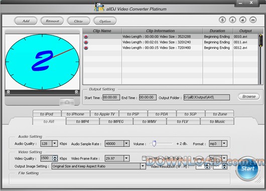 Alldj Video Converter Platium là một phần mềm mạnh mẽ, cho phép bạn chuyển đổi đa dạng các định dạng video phổ biến sang các chuẩn như AVI, DivX, Xvid, MPEG1/2, MPEG-4, WMV, FLV. Đồng thời, công cụ này hỗ trợ chuyển đổi video để tương thích với các thiết bị di động như iPod, iPhone, AppleTV, PSP và điện thoại di động (3GP).