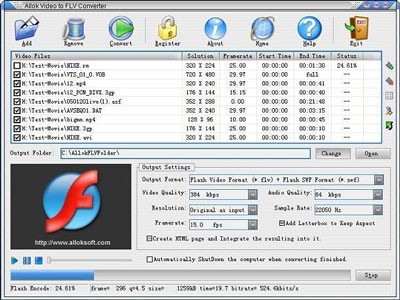 Allok Video to FLV Converter có thể xử lý hầu hết các định dạng video thông dụng như DivX, XviD, AVI, WMV, MPG, MPEG, MP4, FLV, 3GP, ASF, RM, RMVB, MOV, ASX, MKV, OGM, SVCD, VCD, VOB và chuyển đổi chúng sang định dạng Flash Video (SWF và FLV).