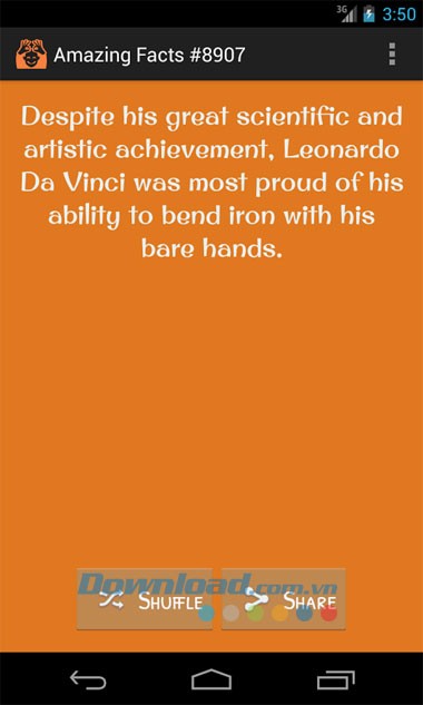 Hơn nữa, với tính năng chia sẻ tiện lợi, người dùng Amazing Facts (11000+) for Android có thể chia sẻ những kiến thức độc đáo này với bạn bè và người thân qua email, tin nhắn SMS, hoặc các mạng xã hội như Facebook và Twitter .