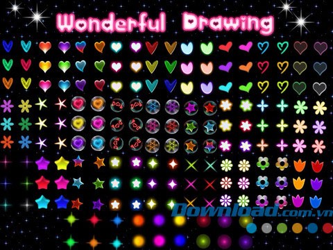Bạn có thể lựa chọn từ hơn 140 hình nền tuyệt đẹp, được sắp xếp thành 10 chủ đề khác nhau: Fantasy, Nature, Board, Flower, Star, Heart, Baby, Birthday, Halloween, Xmas.