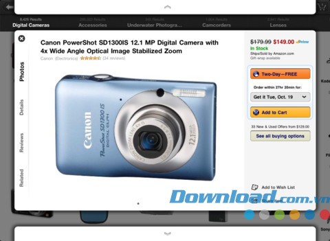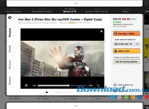 Để tìm hiểu chi tiết hơn về sản phẩm, hãy chọn từ lưới ảnh hàng hóa. Màn hình hiển thị thông tin sản phẩm sẽ cung cấp hình ảnh, video liên quan, thậm chí là đoạn mẫu 30 giây cho các sản phẩm âm nhạc. Bên cạnh đó, các tab thông tin chi tiết, mô tả, đánh giá của người dùng và các sản phẩm gợi ý cũng được tích hợp.
