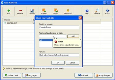 Việc thiết lập và cấu hình Any Weblock không đòi hỏi bất kỳ kiến thức chuyên sâu về mạng. Bạn chỉ cần cung cấp tên miền hoặc subdomain của những trang web mà bạn muốn chặn.