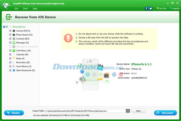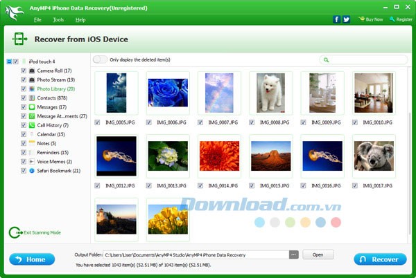 Quá trình quét thiết bị sẽ mất một vài giây. Sau đó, bạn có thể xem tất cả dữ liệu được liệt kê trong các thư mục tương ứng. Bạn có thể xem trước các tập tin sao lưu của mỗi thư mục trước khi phục hồi và đánh dấu các file cần thiết, sau đó nhấn nút Recover để lưu chúng về máy tính.