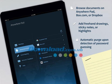 Anywhere Pad for iOS mang đến cho người dùng các thiết bị iPhone, iPad hoặc iPod Touch một ứng dụng hoàn toàn miễn phí, hỗ trợ đắc lực trong việc họp, thuyết trình và phối hợp công việc một cách di động.