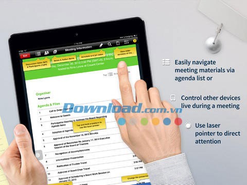 Ứng dụng này được biết đến như một giải pháp phòng họp trực tuyến hàng đầu, tạo điều kiện cho sự phối hợp giữa quản trị viên và các thành viên trong ban điều hành thông qua một nền tảng tập trung, dễ dàng truy cập trên các thiết bị di động.