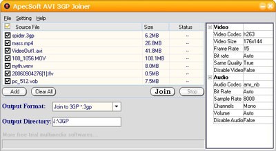 Bạn nhấn nút Add để thêm các file video cần ghép nối vào danh sách. Tại mục Output Format, bạn chọn định dạng file video đầu ra là 3gp (để xem trên điện thoại di động) hoặc avi (để xem trên máy tính).
