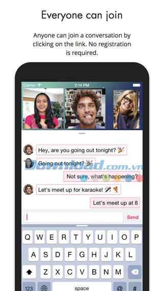 Bạn có thể tạo phòng chat riêng và chia sẻ đường dẫn tham gia qua cửa sổ chat, Facebook Messenger , tin nhắn SMS hoặc email. Một điểm cộng lớn là không yêu cầu đăng ký tài khoản; người nhận chỉ cần nhấp vào đường dẫn để tham gia ngay vào cuộc trò chuyện nhóm.