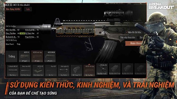 Arena Breakout VNG cho phép người chơi tùy chỉnh vũ khí một cách linh hoạt thông qua hệ thống Gunsmith hiện đại. Game thủ có thể kết hợp hơn 700 bộ phận vũ khí khác nhau, lắp đặt vào 10 vị trí tùy chỉnh để tạo ra những khẩu súng độc đáo.