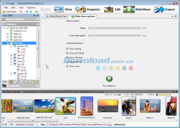 Phần mềm tích hợp trình xem ảnh toàn màn hình, hỗ trợ đa dạng định dạng, bao gồm cả file RAW. Chế độ Slideshow cho phép tạo các buổi trình chiếu ảnh sinh động với nhiều hiệu ứng chuyển cảnh như Fade và Slide. Người dùng còn có thể thực hiện các chỉnh sửa ảnh cơ bản ngay trong trình xem, mà không cần mở ứng dụng khác.